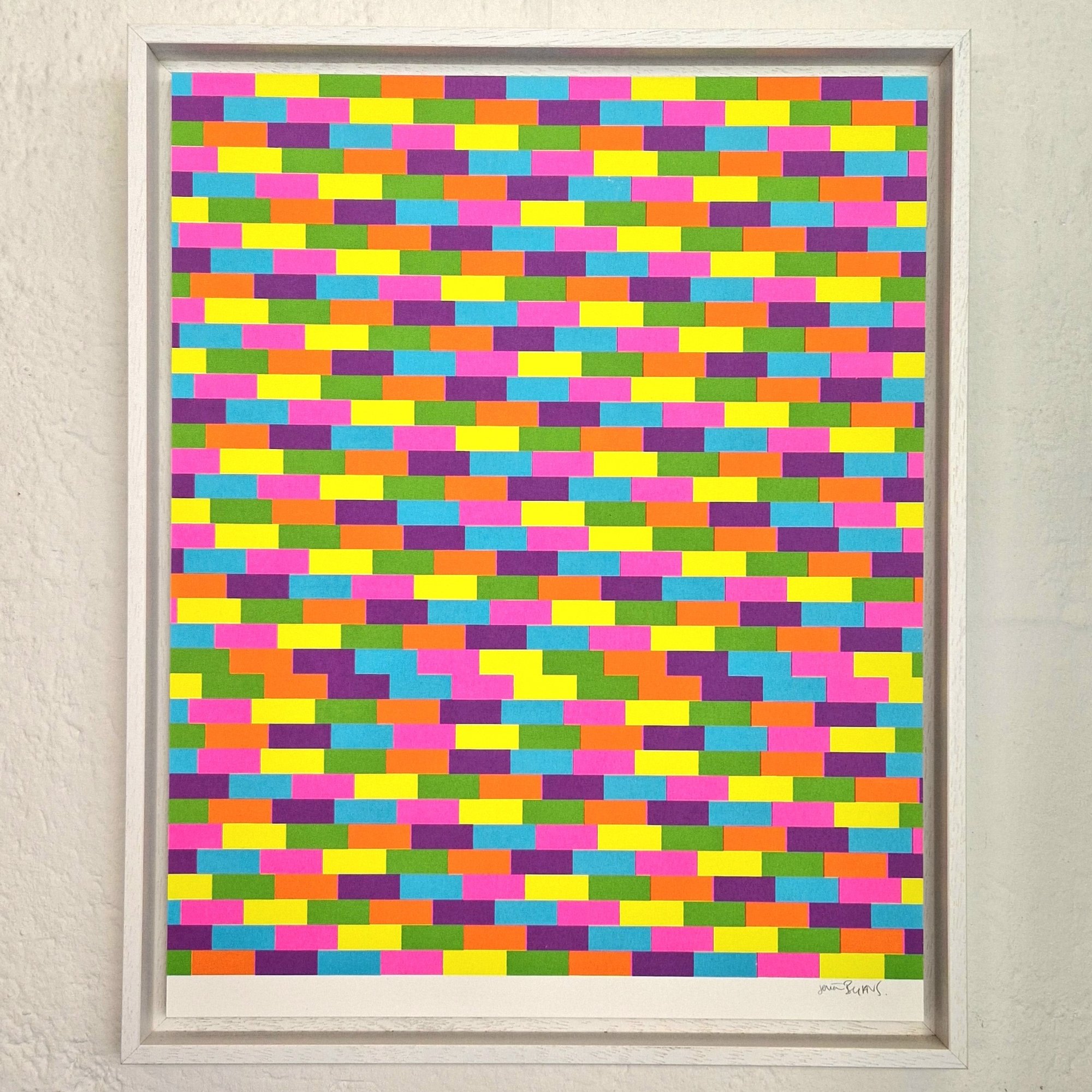 Dieser Druck ist ein "outtake" aus einer Plakatproduktion, um das Mischverhältnis der Farben zu testen. Ein Einzelstück, kaschiert auf Hartschaumplatte und in einen Schattenfugenrahmen geleimt.