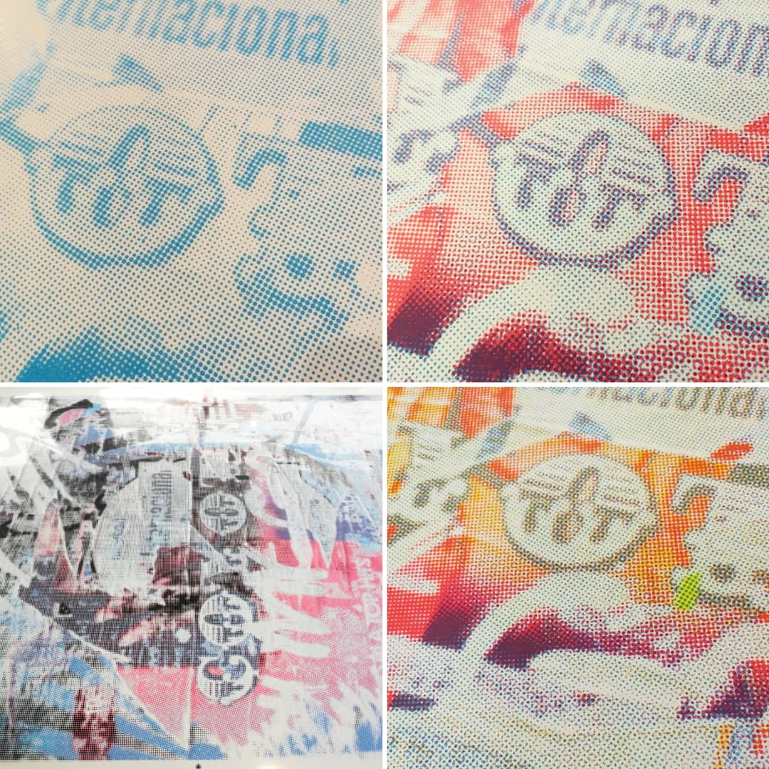 Mit der im Buchdruck üblichen Technik, Fotos im Rasterdruck mittels vier lasierender Druckfarben (Cyanblau, Magentarot, Yellow und Konturschwarz) widerzugeben, habe ich dieses Motiv im Siebdruck umgesetzt.