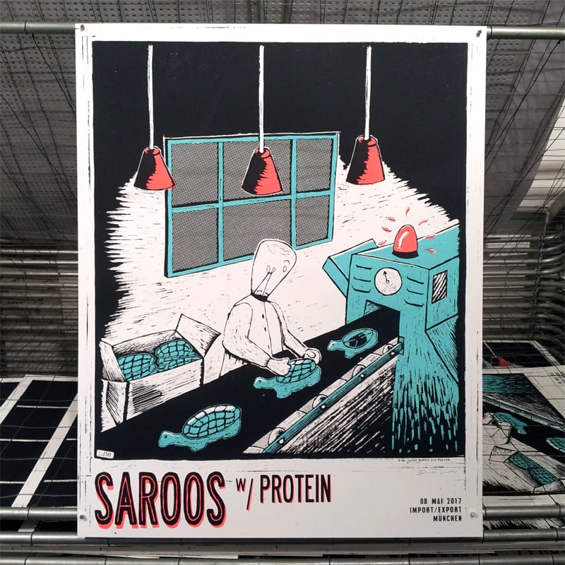 Almost exactly three years after my last poster for SAROOS this poster has been produced on the day of the show and was finally a last minute-decision. Within 8 hours I prepared the layers, burnt the screens, printed the edition to have it done for the show.